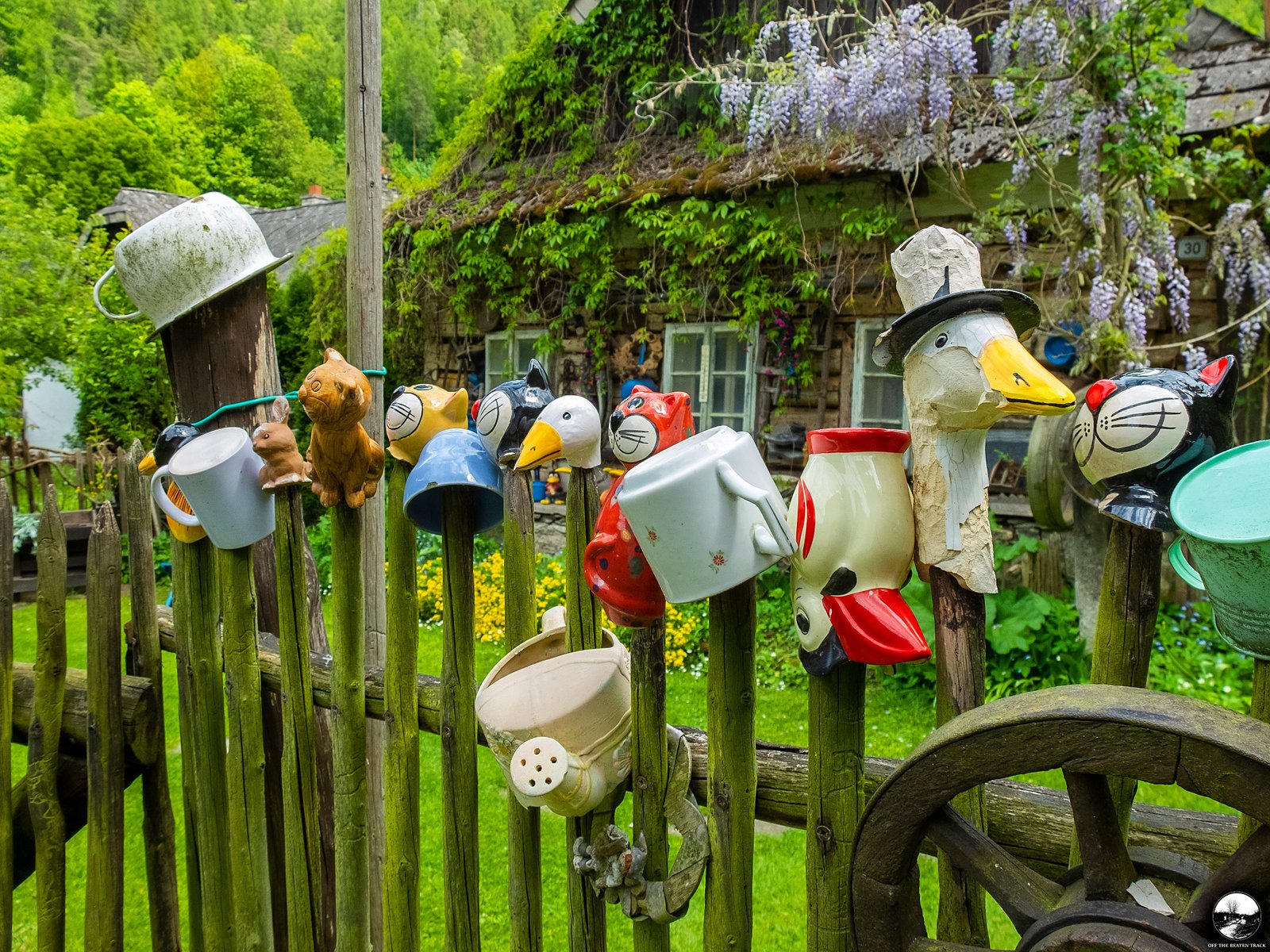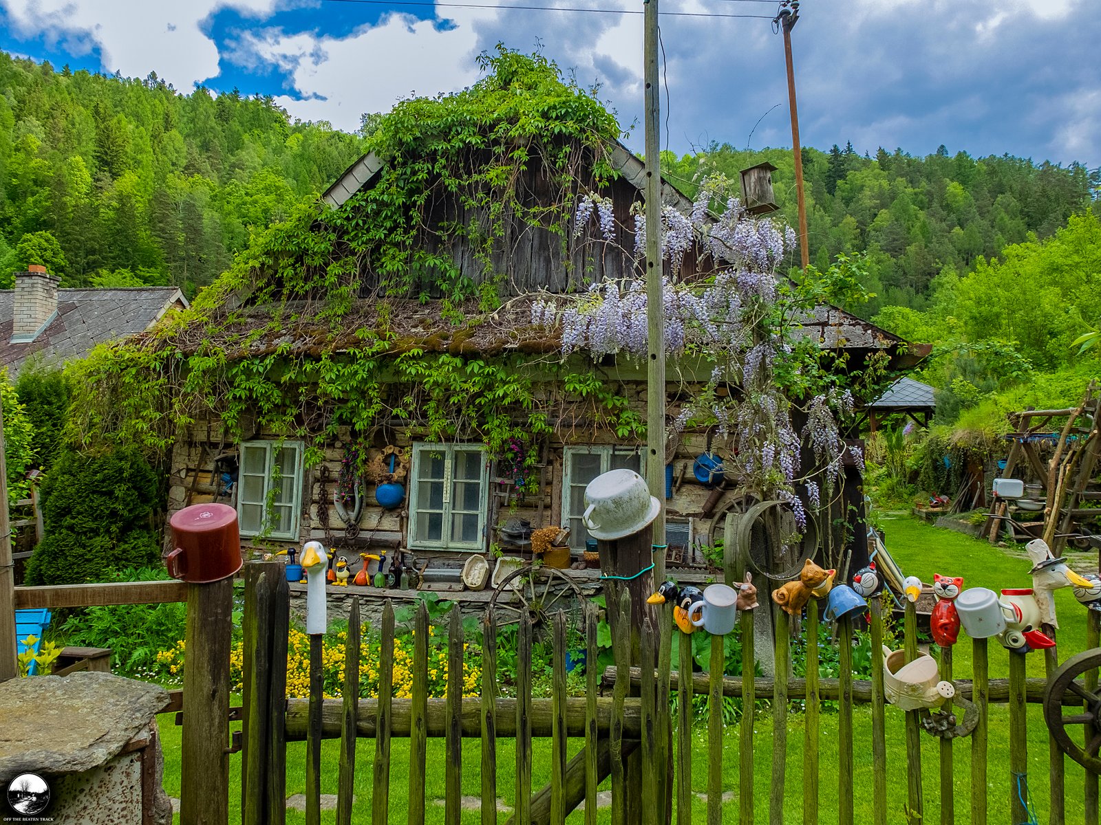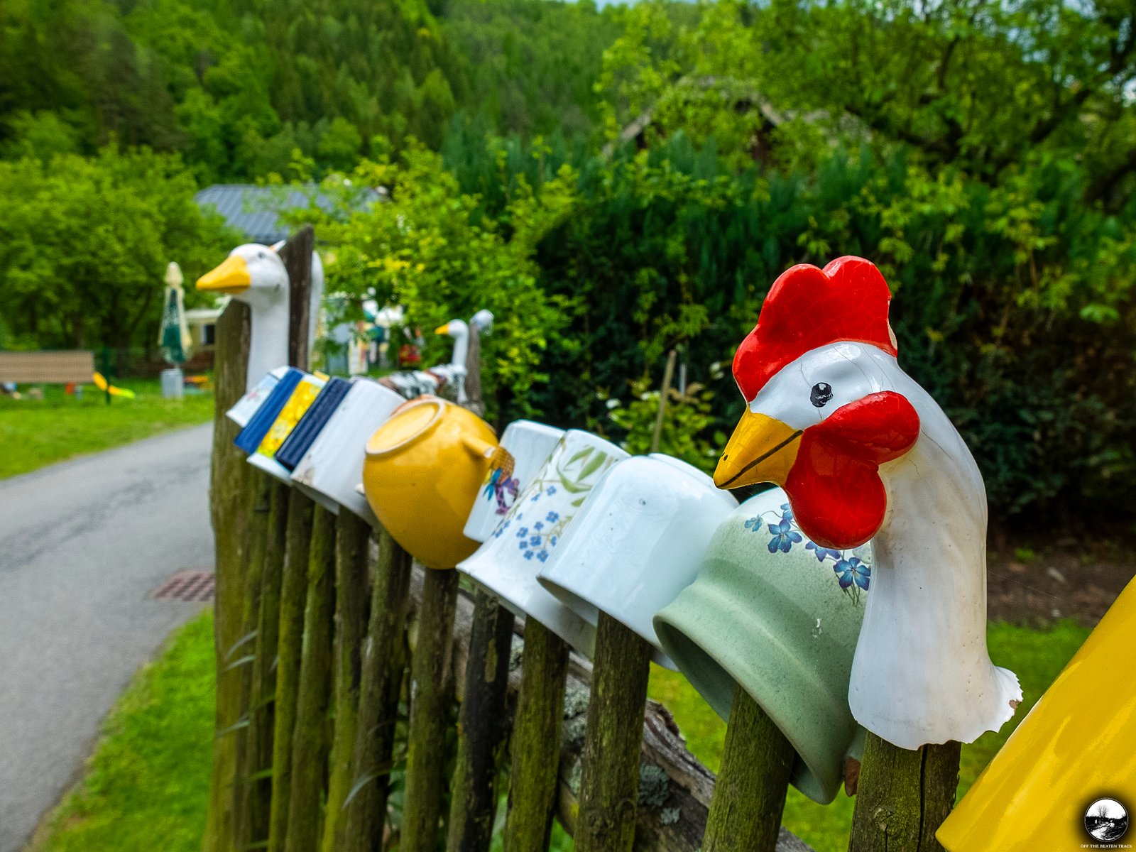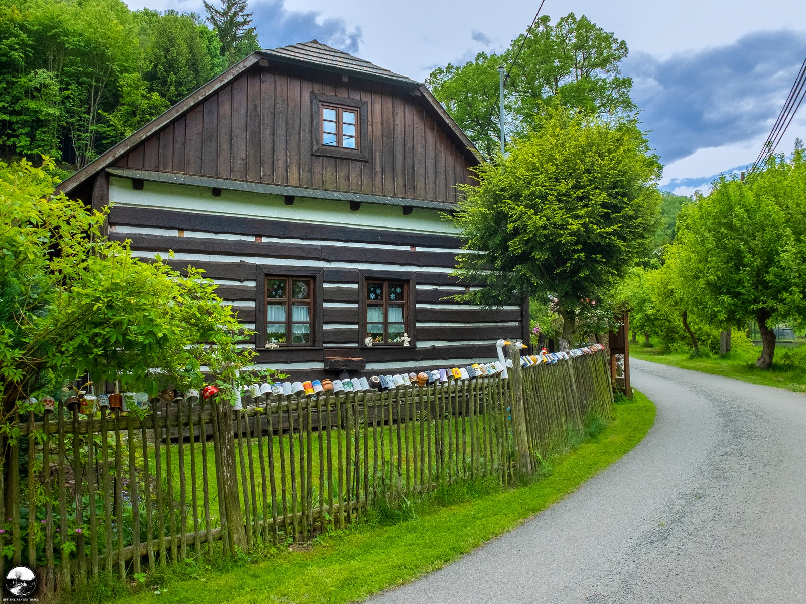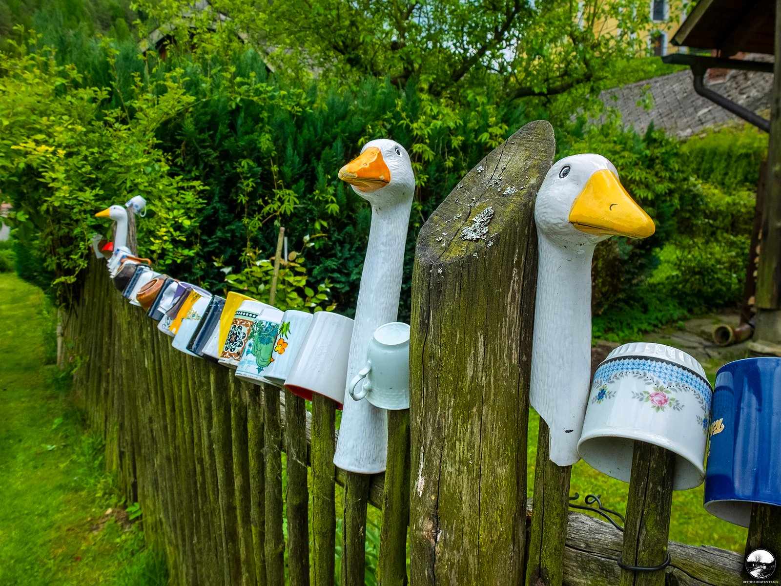 Another highlight is the fence, decorated with dozens of colorful cups. While this type of decoration is fairly common in rural parts of the Czech Republic, this particular one is unique. Hidden among the cups are a few adorable goose heads, giving it a special touch.