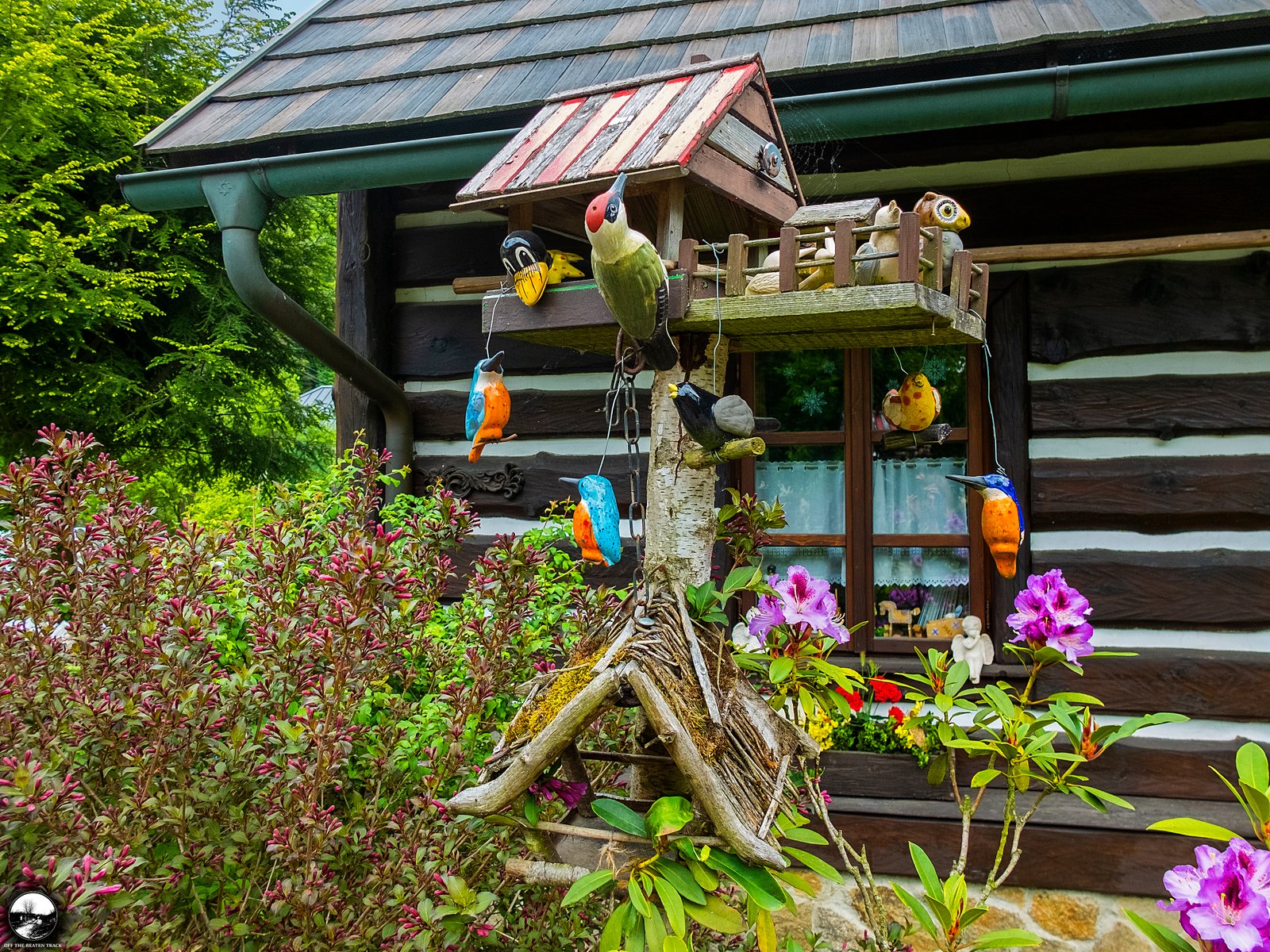 And there’s more. The entire area around the cabin is filled with small decorations—figurines, dishes, and all kinds of household items. It’s the kind of place that makes you want to slow down and take a closer look at all the little details. The beauty of this spot lies in its creativity and warmth.