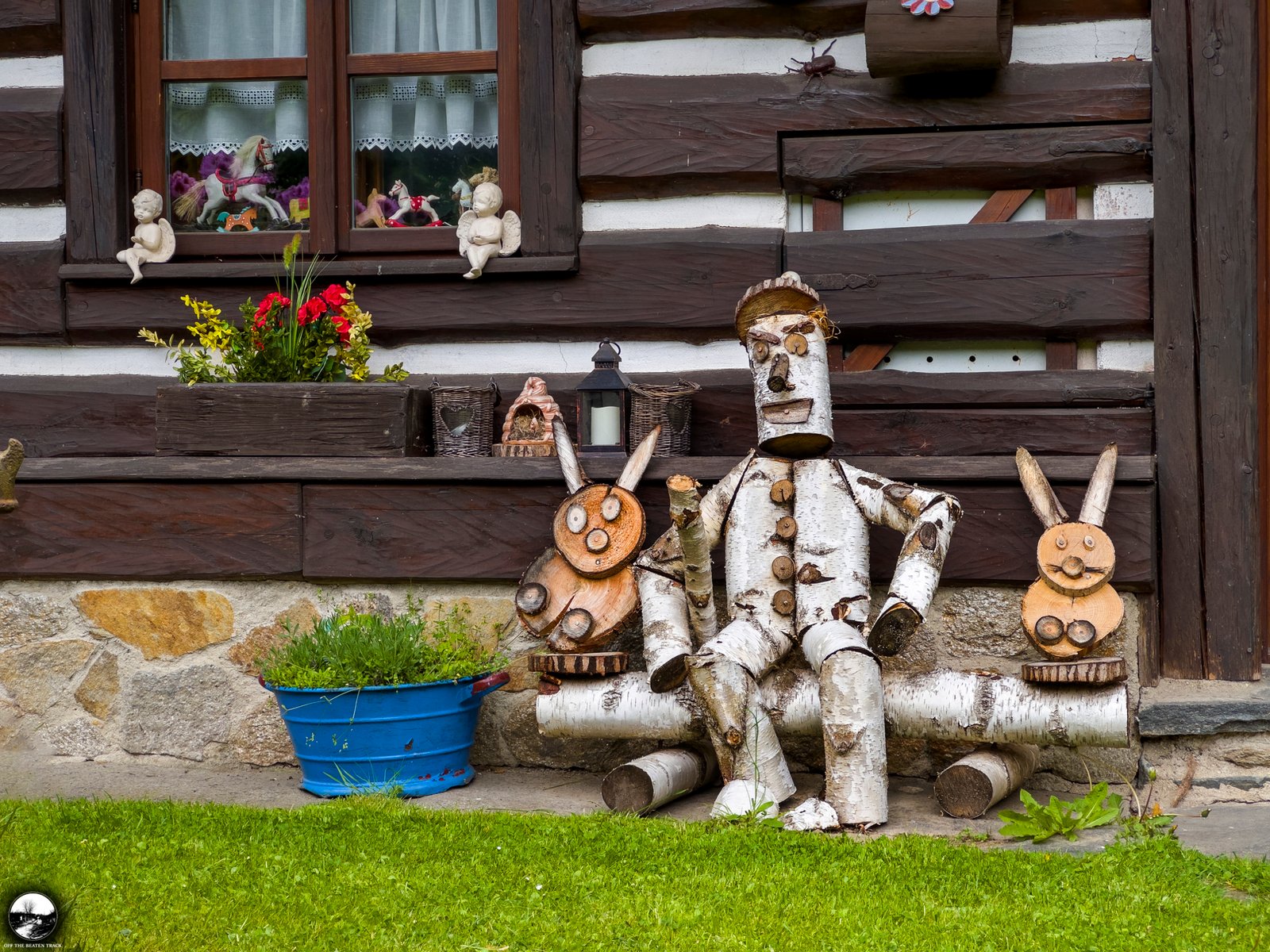 The first thing you’ll notice as you approach is a cozy wooden cabin. While wooden cabins are charming on their own, this one stands out thanks to the decorations around it. Near the entrance, you’ll find a few eye-catching sculptures: a nicely dressed lady, a cheerful wooden man, and a couple of rabbits—all ready to greet anyone who passes by.